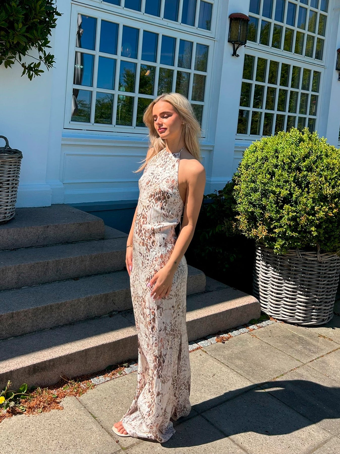 Mit seinem eleganten Neckholder-Ausschnitt und der leichten, fließenden Passform ist dieses Kleid perfekt für heiße Tage und warme Sommerabende. Der Stoff ist superweich und schmiegt sich schön an den Körper, während das zarte Muster in neutralen Tönen dem Kleid einen exklusiven und dennoch entspannten Look verleiht.