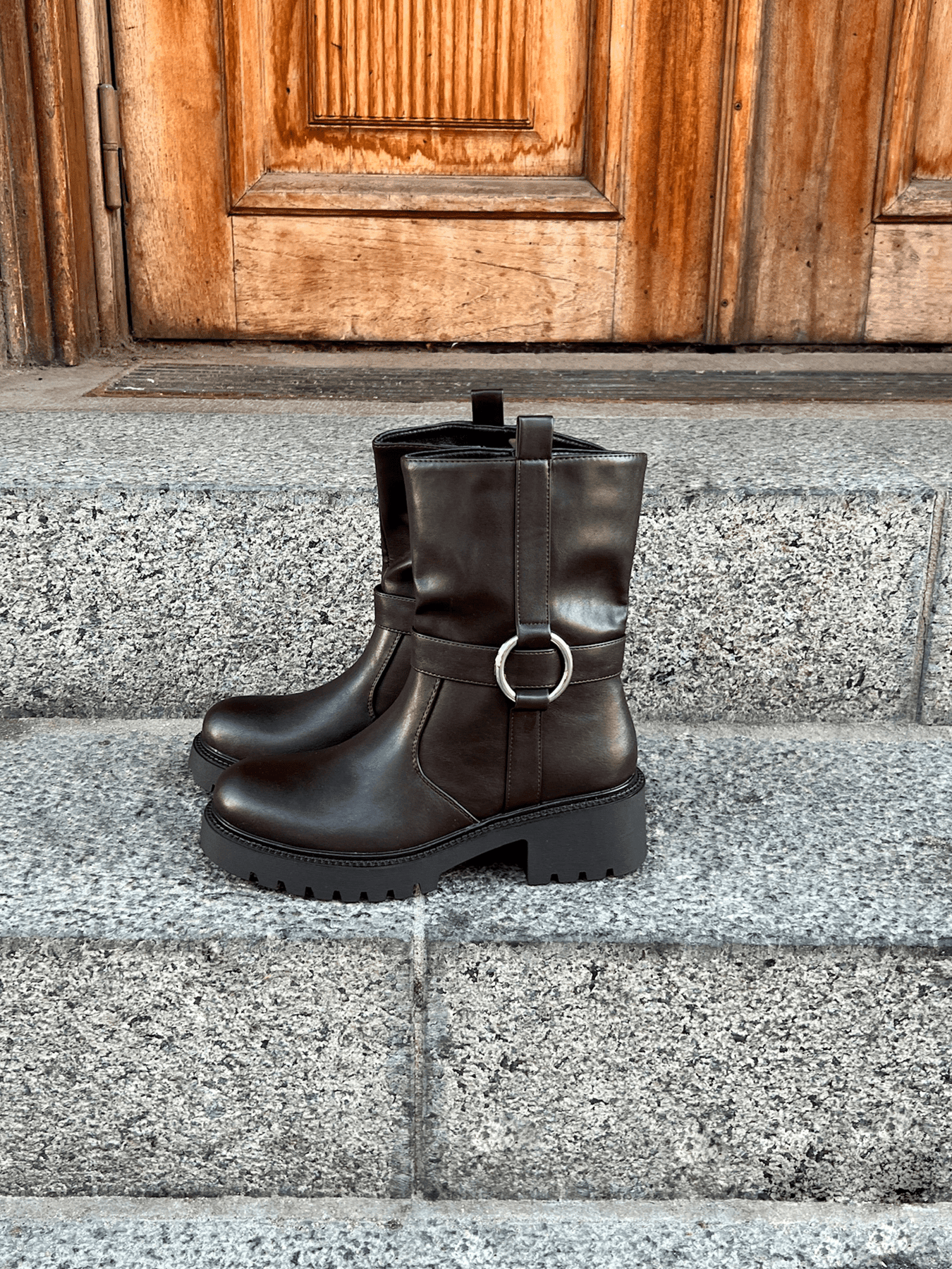 Bringen Sie einen modernen und rauen Touch in Ihre Garderobe mit diesem stylischen hellbraunen Stiefel. Das Design kombiniert eine klobige, klobige Sohle mit einem coolen silberfarbenen Ring-Detail für einen kantigen Look, ohne auf Komfort zu verzichten.
