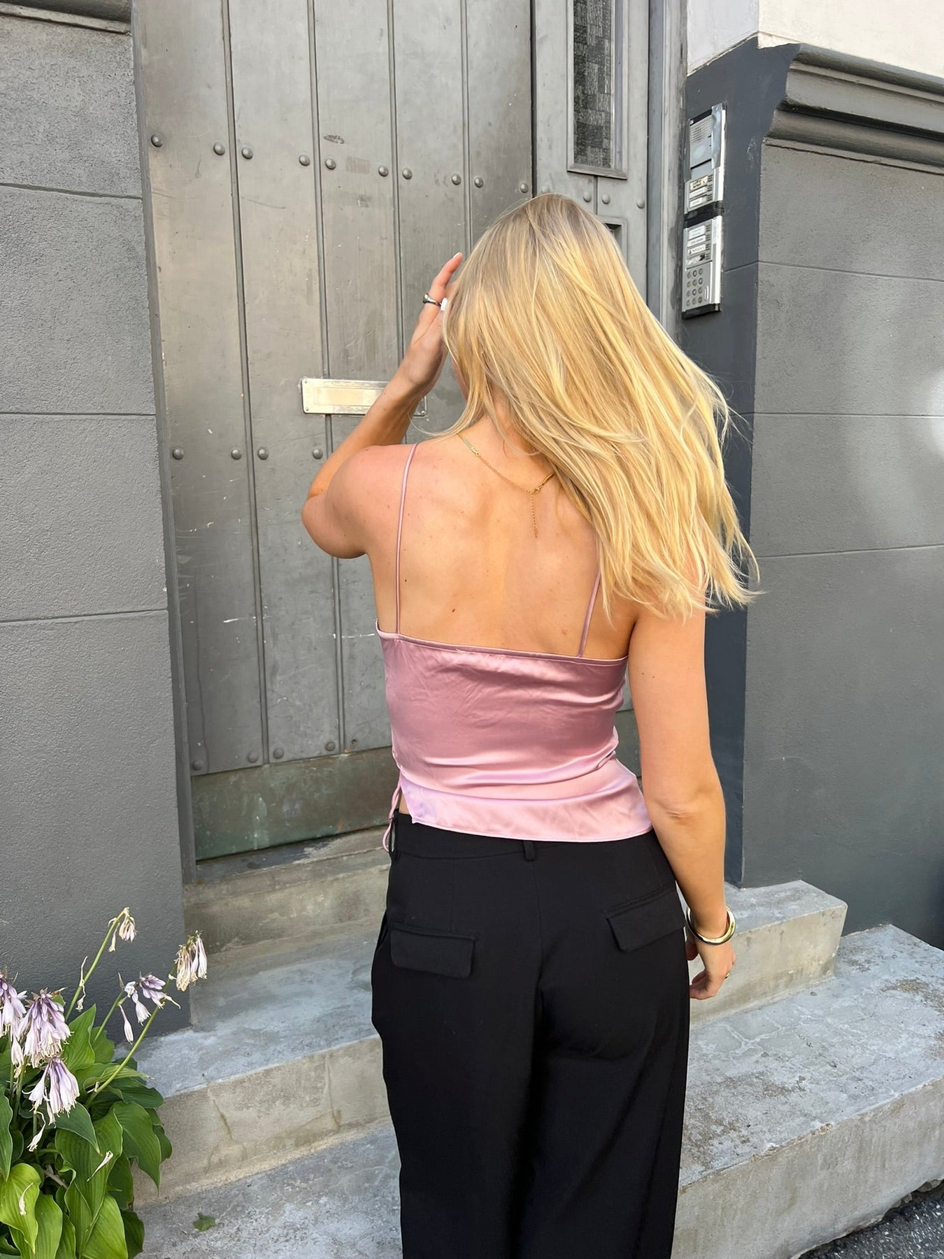 Mit seinem schmeichelhaften, verstellbaren Schnitt und den zarten Bindebändern an der Vorderseite kreiert es einen schmeichelhaften Look, der Ihre Silhouette auf die schönste Weise akzentuiert. Die dünnen Träger und das offene Design machen es ideal für warme Tage und festliche Abende.