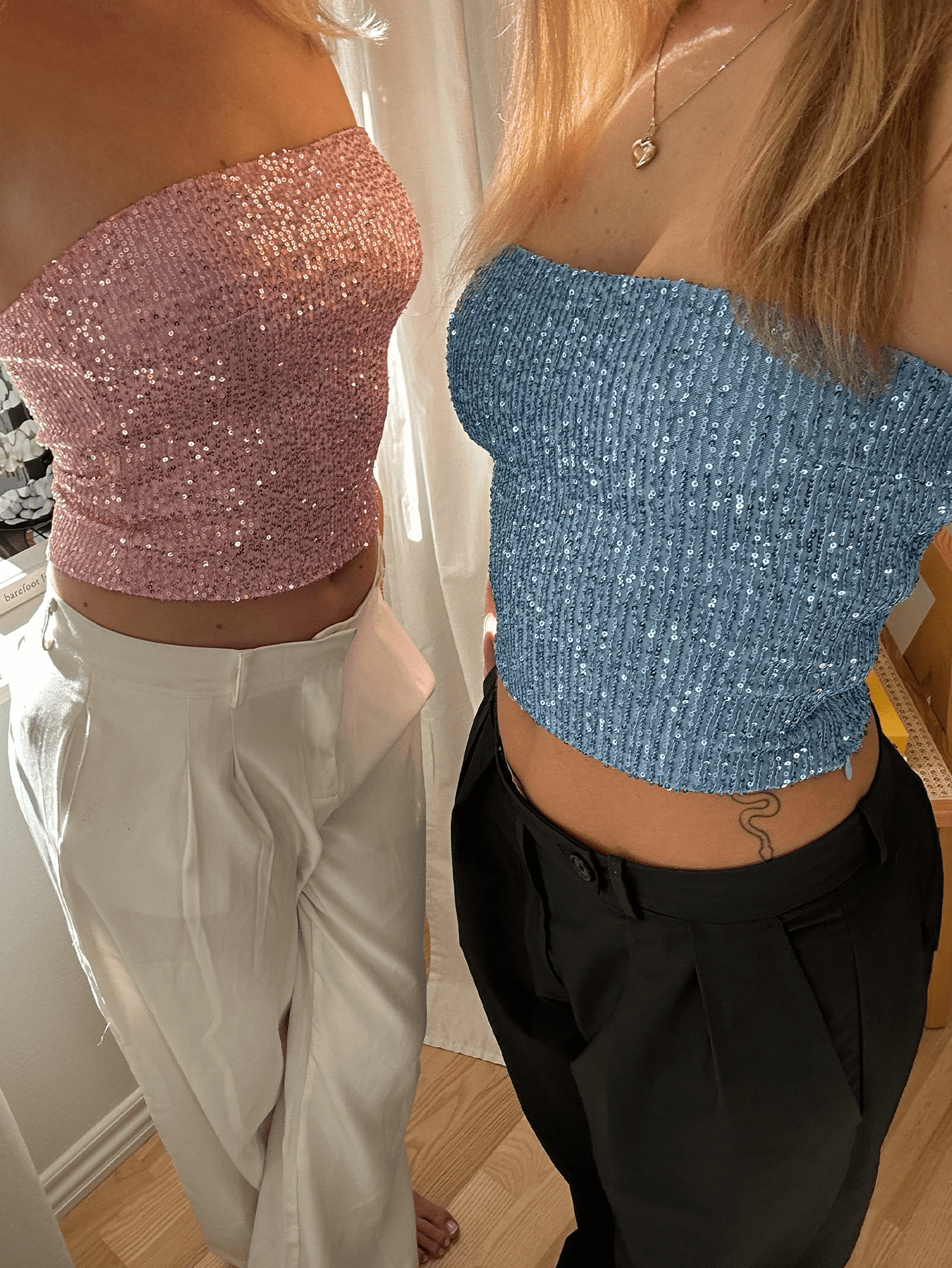 Vervollständigen Sie Ihren Silvester-Look mit diesem umwerfenden hellblauen Glitzertop, das mit vielen funkelnden Pailletten besetzt ist! Es fängt das Licht ein und lässt Sie strahlen, wo immer Sie hingehen. Perfekt, um die ganze Nacht durchzutanzen - oder einfach nur, um die Aufmerksamkeit auf sich zu ziehen!