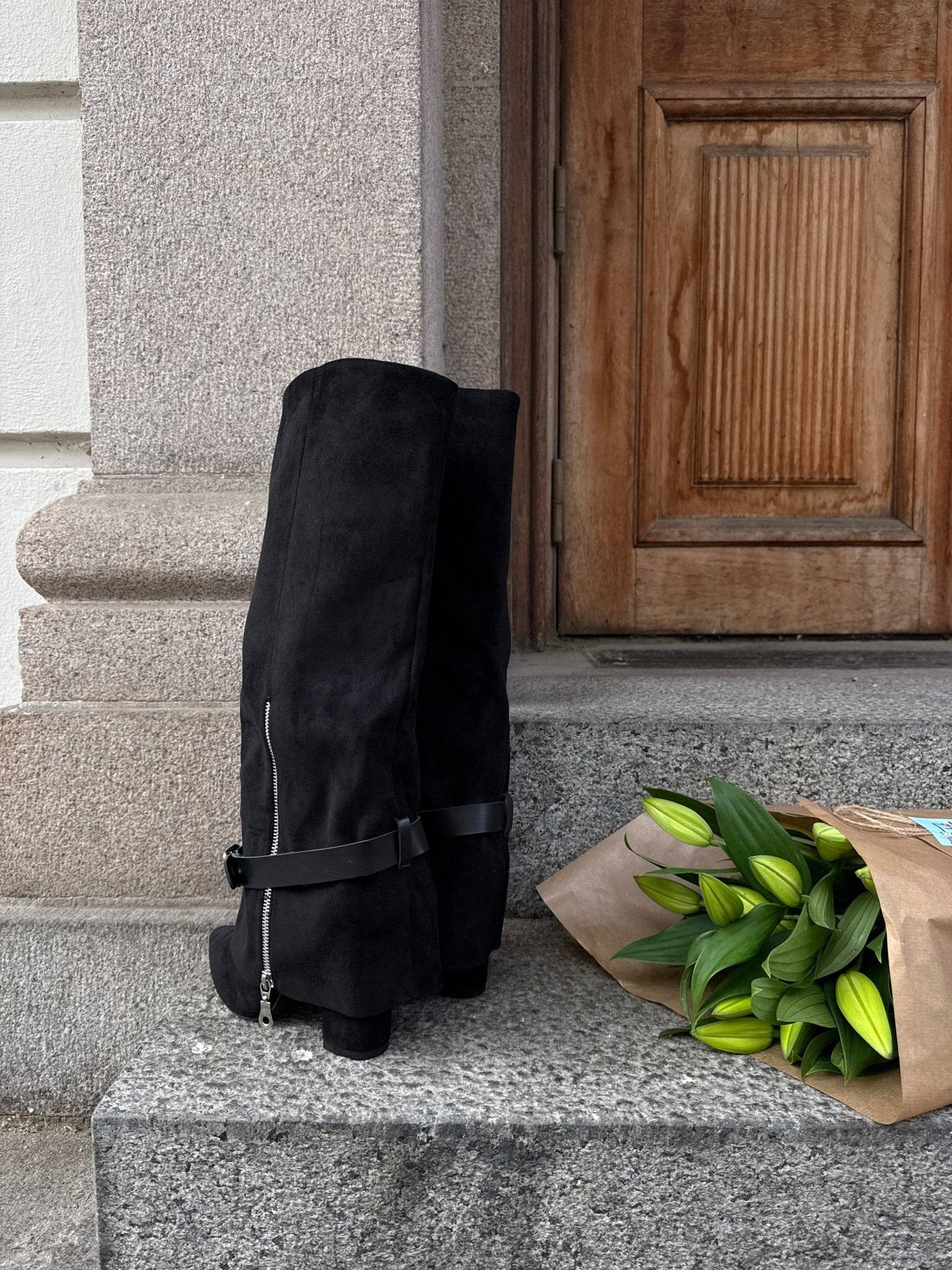 Unser Dagmar-Stiefel in Schwarz ist ein kniehoher Stiefel aus Wildlederimitat mit einer lockeren Passform und einem markanten Schaft. Das Design zeichnet sich durch einen dekorativen Reißverschluss an der Außenseite und einen breiten Riemen mit Metallschnalle um den Knöchel aus, was dem Stiefel einen modernen und rauen Look verleiht.