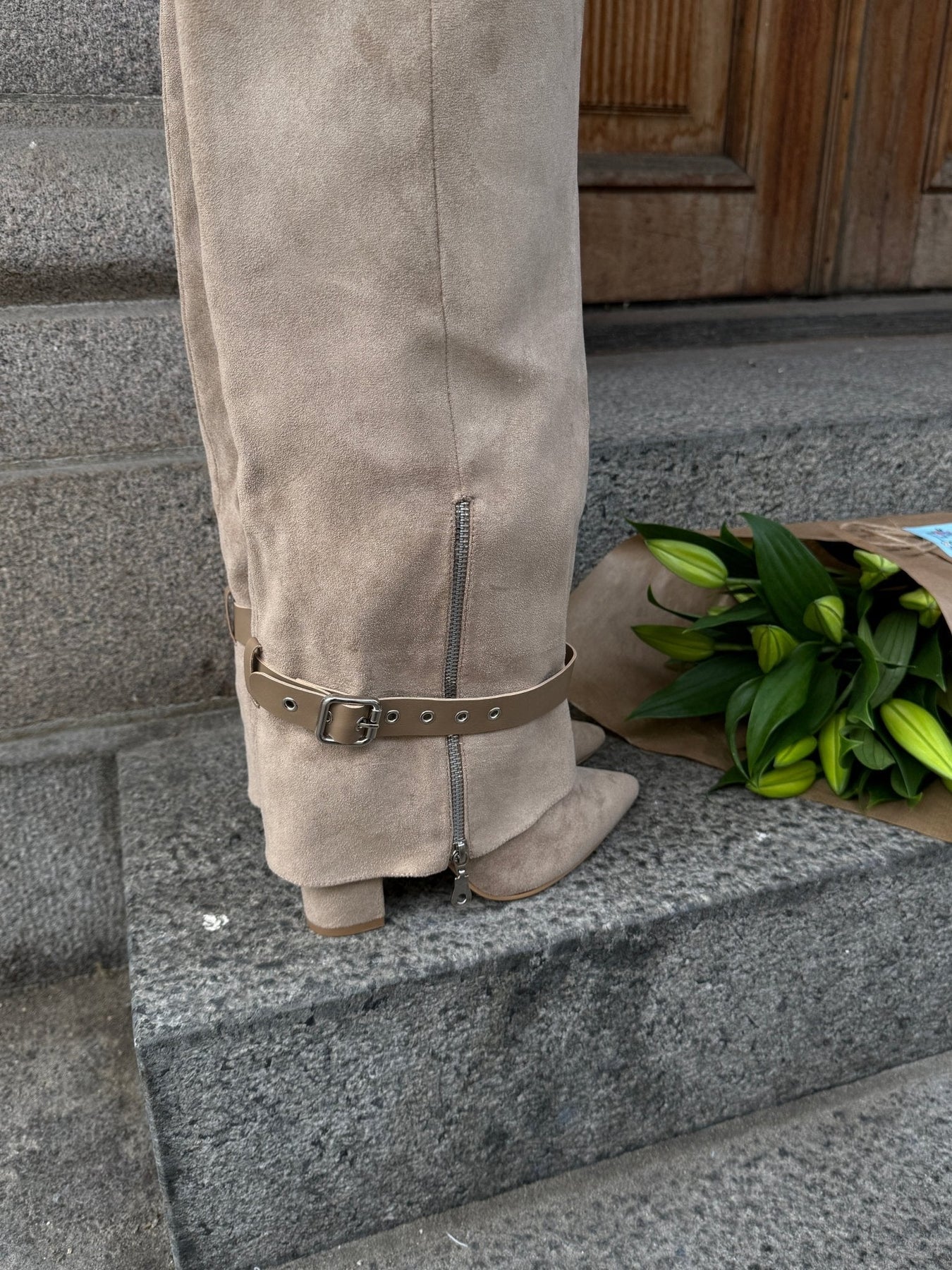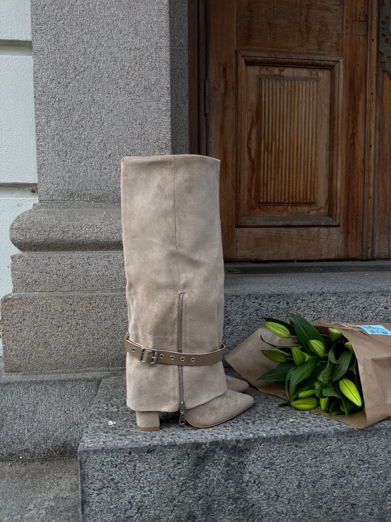 Unsere Dagmar Stiefel in Taupe sind kniehohe Stiefel aus Wildlederimitat mit einer lockeren Passform und einem markanten Schaft. Das Design zeichnet sich durch einen dekorativen Reißverschluss an der Außenseite und einen breiten Riemen mit Metallschnalle um den Knöchel aus, was dem Stiefel einen modernen und rauen Look verleiht.