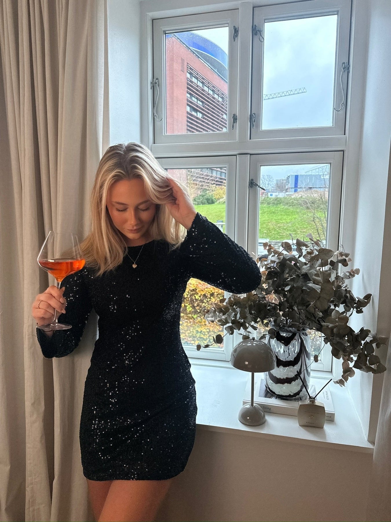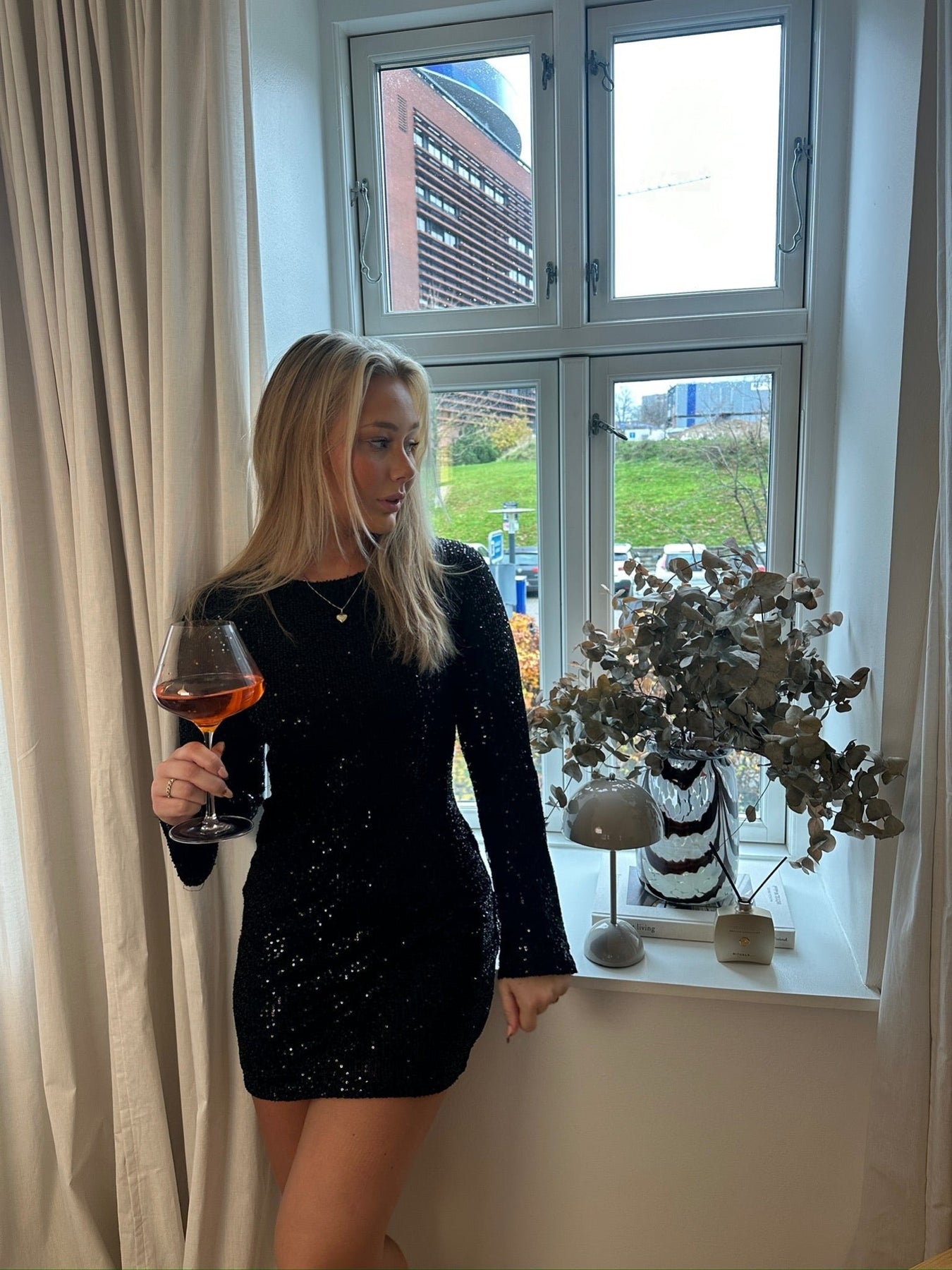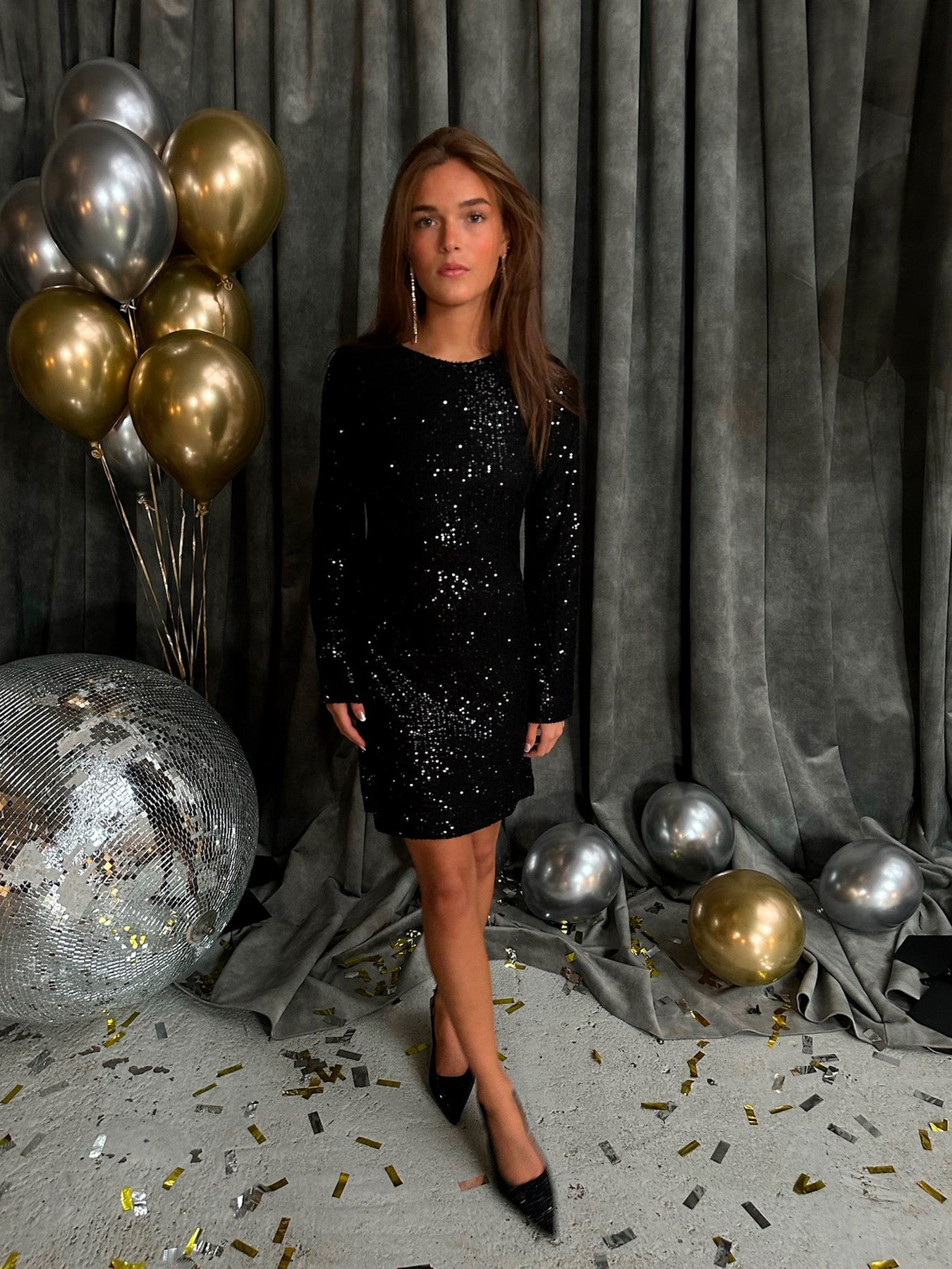 Paillettenkleid mit langen weiten Ärmeln. Das Kleid hat eine enge Passform. Das Kleid ist kurz und hat einen Reißverschluss auf der Rückseite.