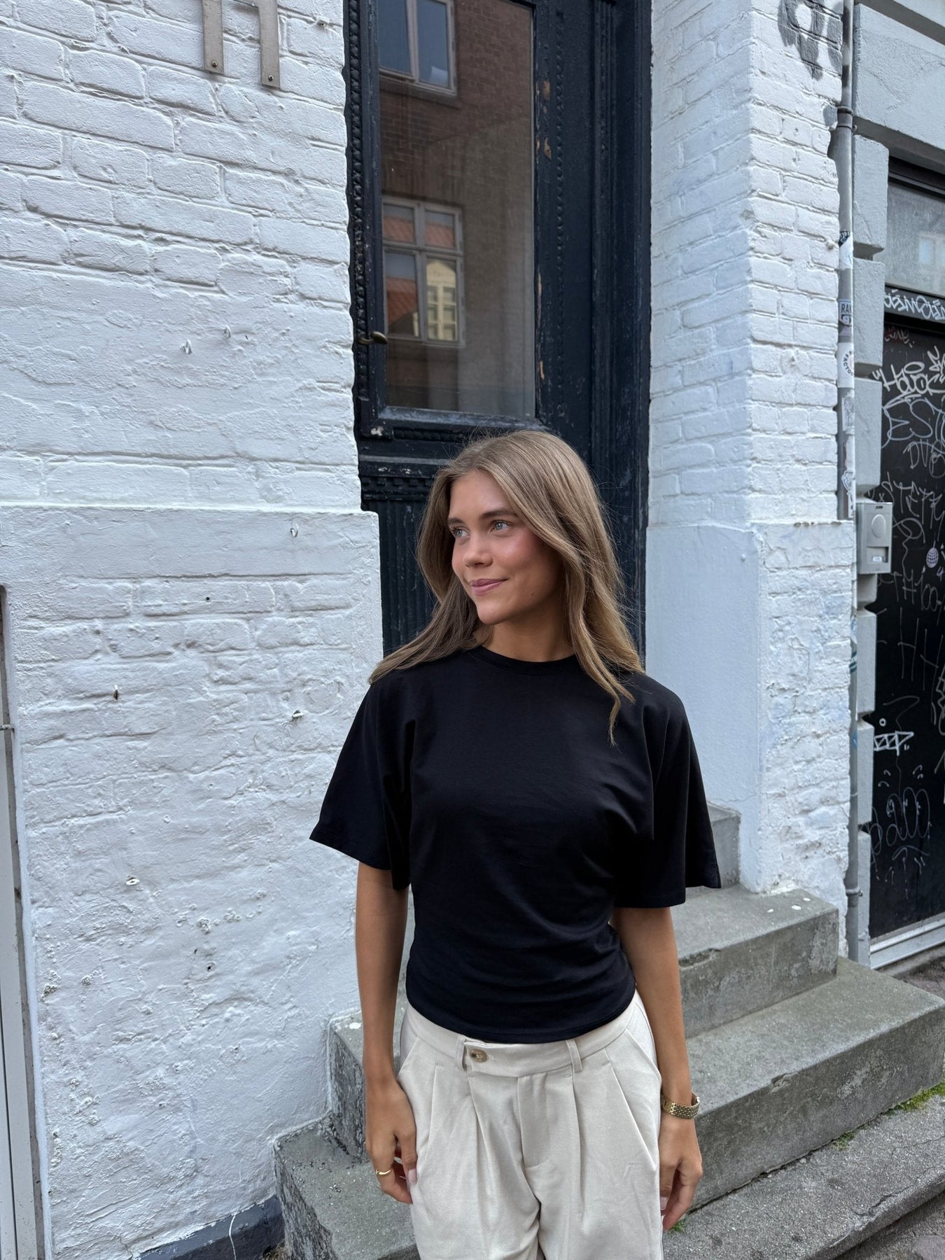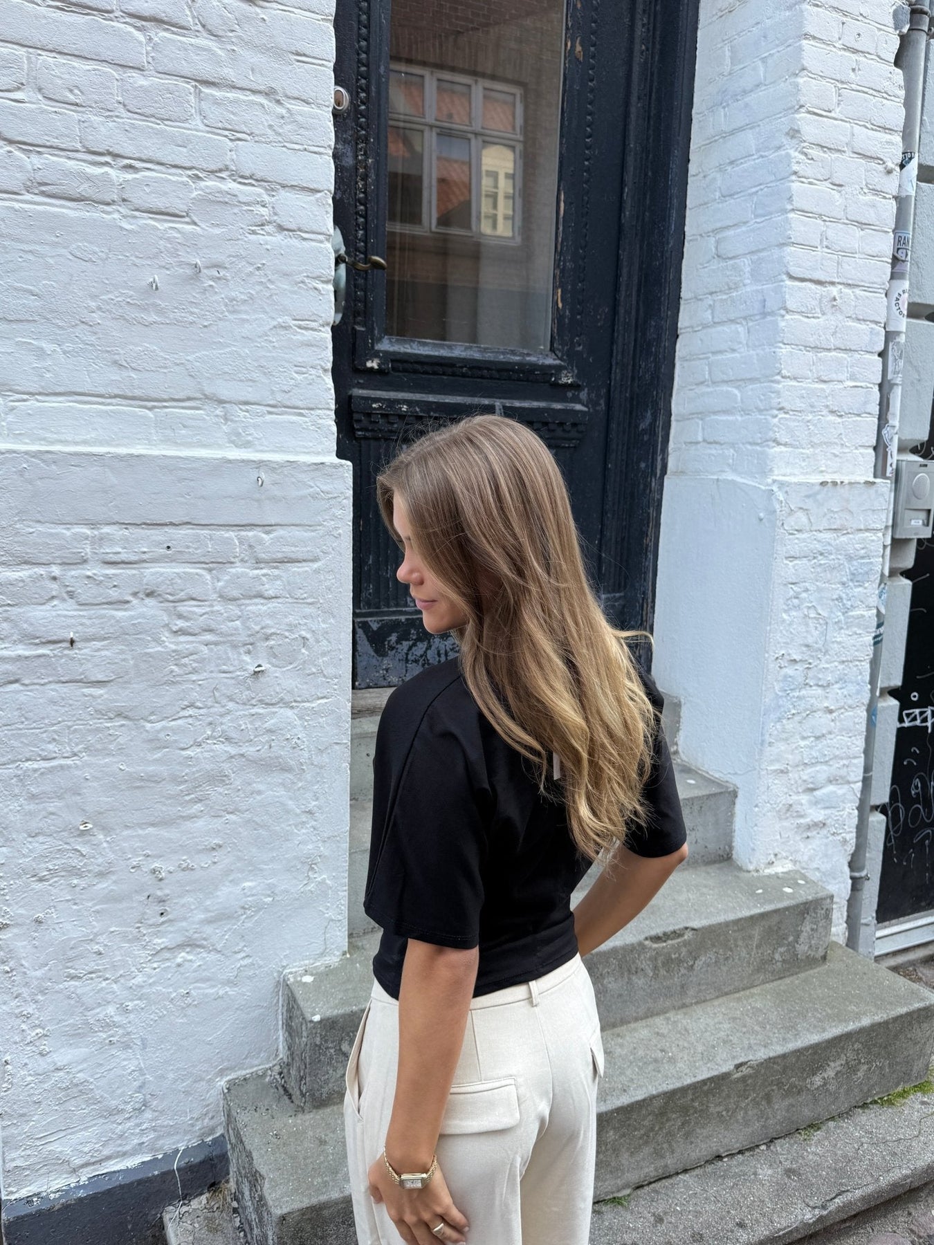 Ein Top, das man immer tragen kann! Es hat eine superschmeichelhafte, taillierte Passform und kurze Ärmel, die es sowohl schlicht als auch feminin machen. Der Stoff ist weich und dehnbar, sodass es gut sitzt, ohne einzuengen.