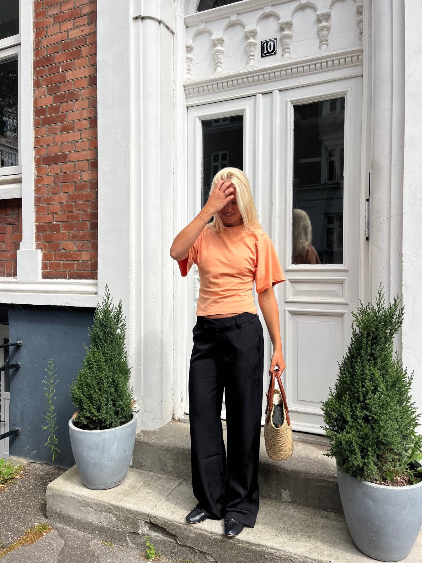 Ein Top, das man immer tragen kann! Es hat eine superschmeichelhafte, taillierte Passform und kurze Ärmel, die es sowohl schlicht als auch feminin machen. Der Stoff ist weich und dehnbar, sodass es gut sitzt, ohne einzuengen.