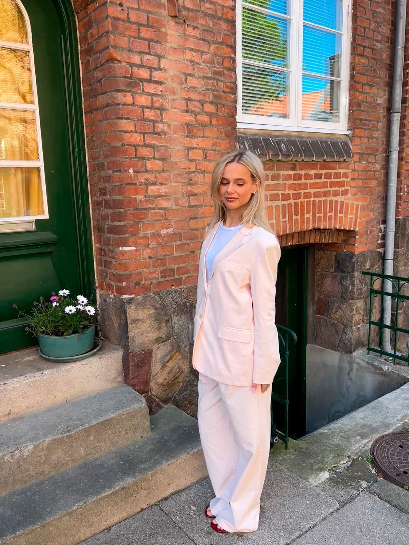 Mit seiner weichen, hellen Farbe und der legeren Passform eignet er sich sowohl für den Alltag als auch für formellere Anlässe. Es sitzt leicht locker am Körper für einen entspannten und dennoch stilvollen Look, und der klassische Knopfverschluss und die hübschen Taschen machen es besonders vielseitig.