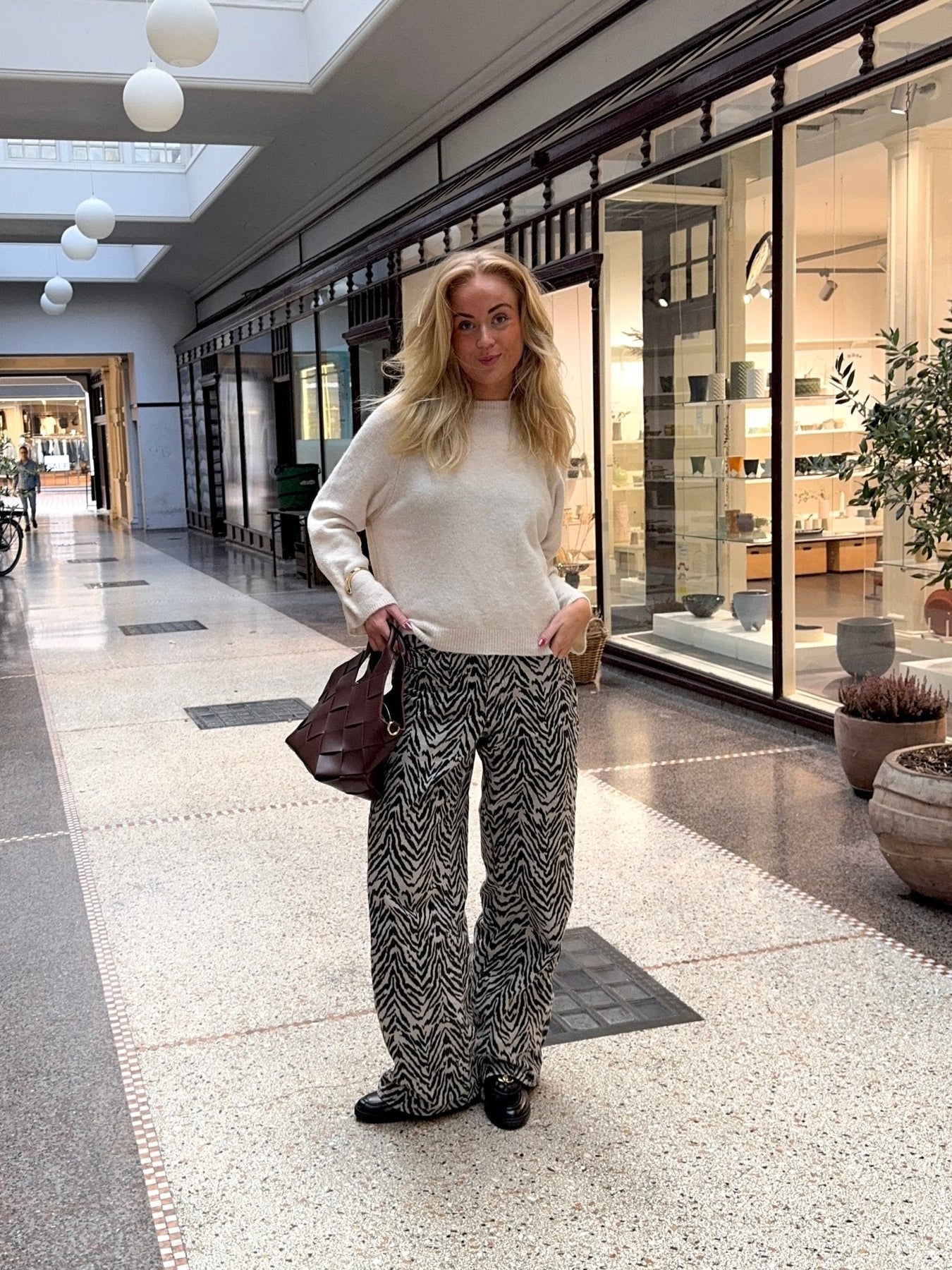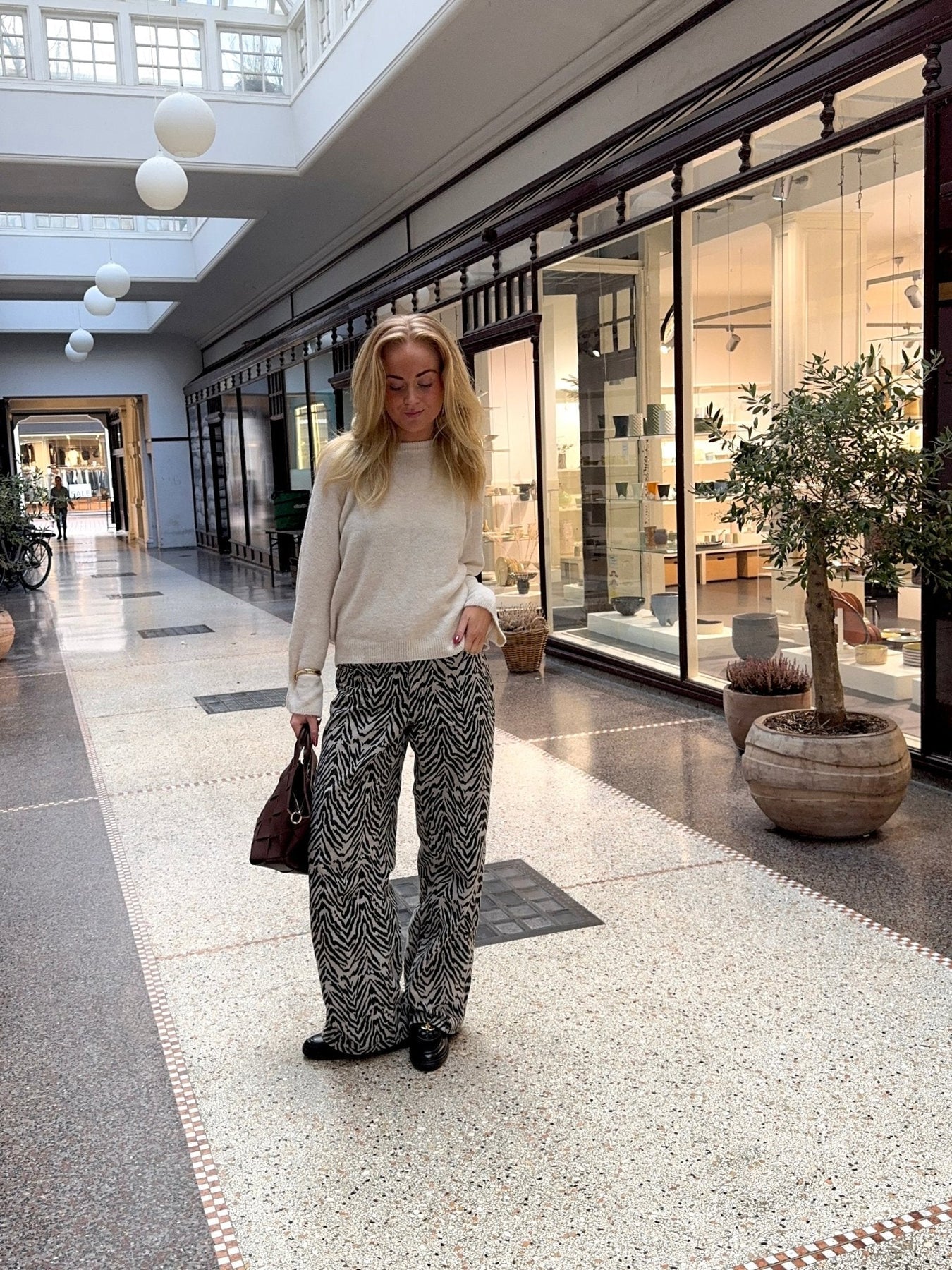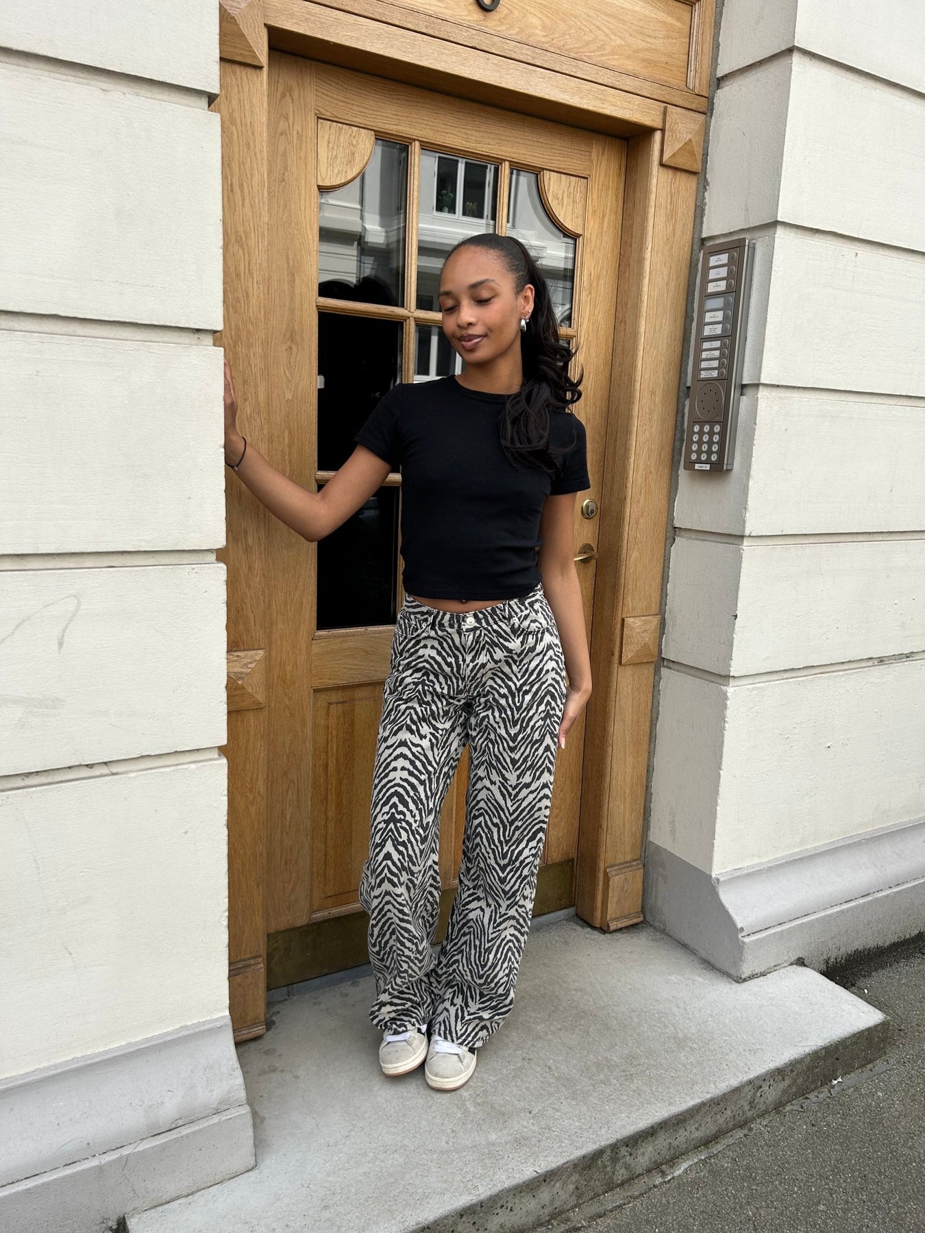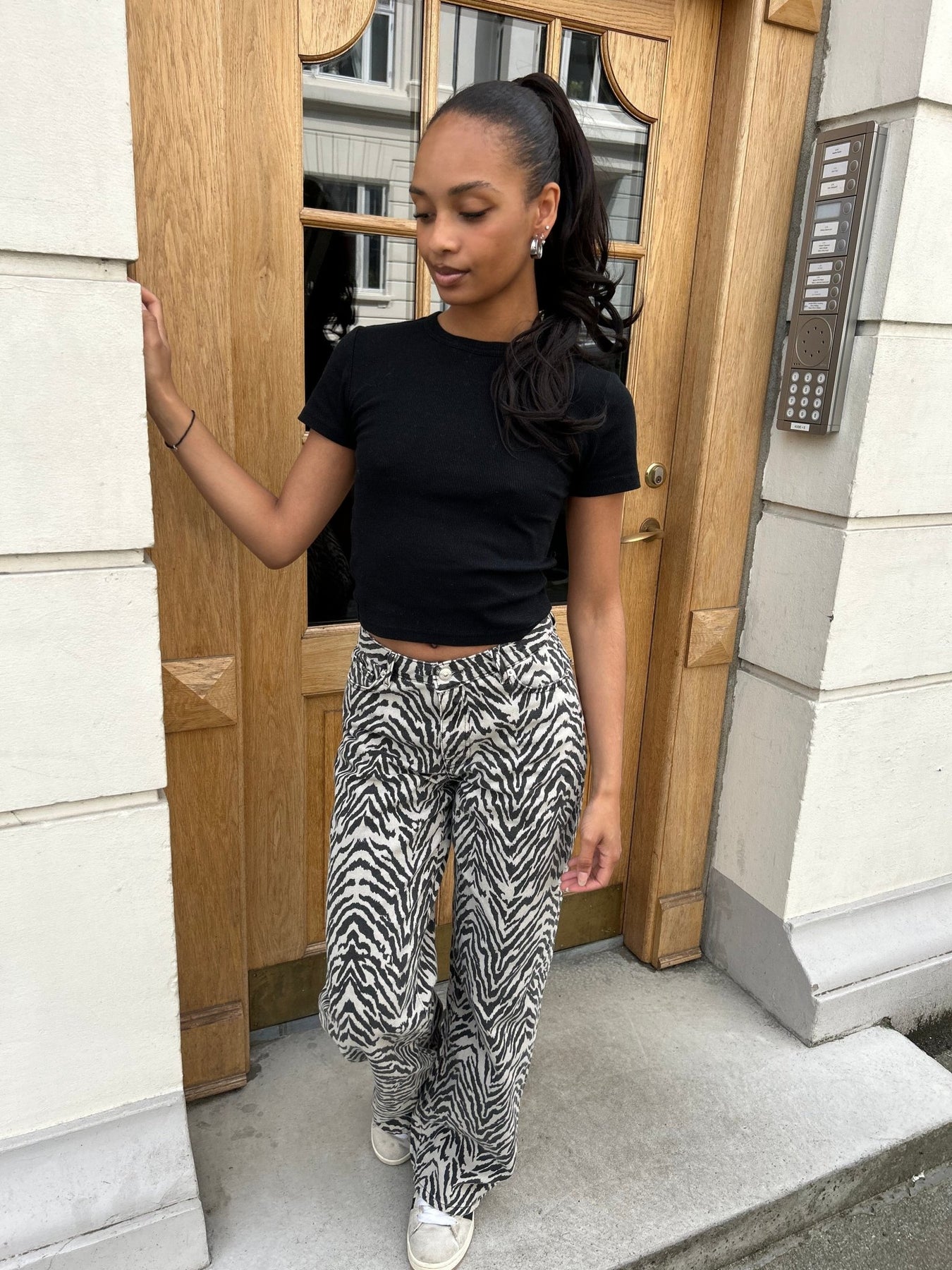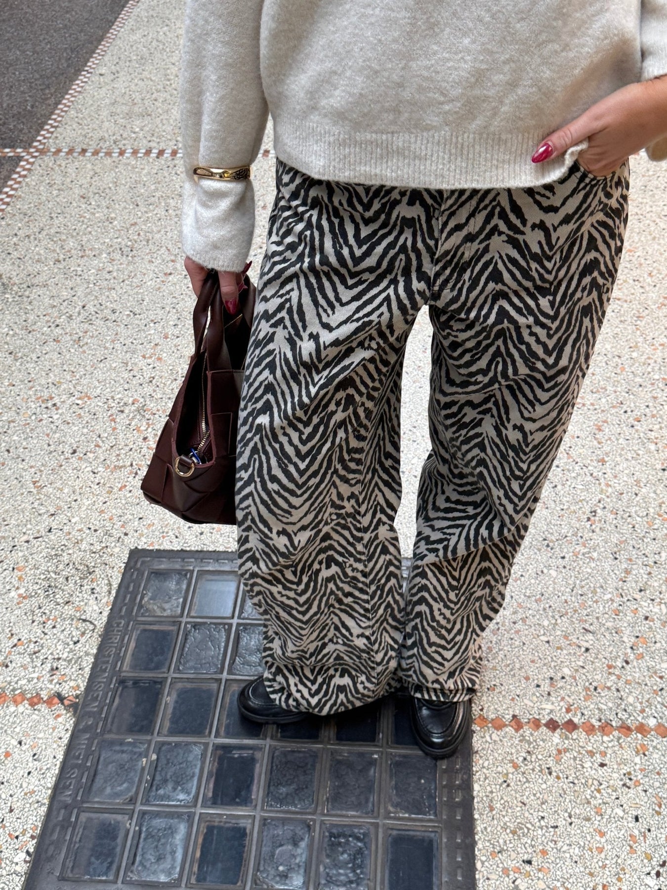 Verleihen Sie Ihrer Garderobe mit dieser einzigartigen Jeans mit Zebramuster einen Hauch von Wildheit. Der auffällige schwarz-weiße Tierprint kombiniert mit einer lässigen Passform macht sie sowohl trendy als auch bequem - perfekt für alle, die sich trauen, aufzufallen. Die Jeans ist aus einer weichen und strapazierfähigen Baumwollmischung gefertigt und die weiten Beine sorgen für einen coolen, lässigen Look. Kombinieren Sie sie mit einem einfachen Strickpullover und Loafers für ein müheloses Outfit mit Pfiff.