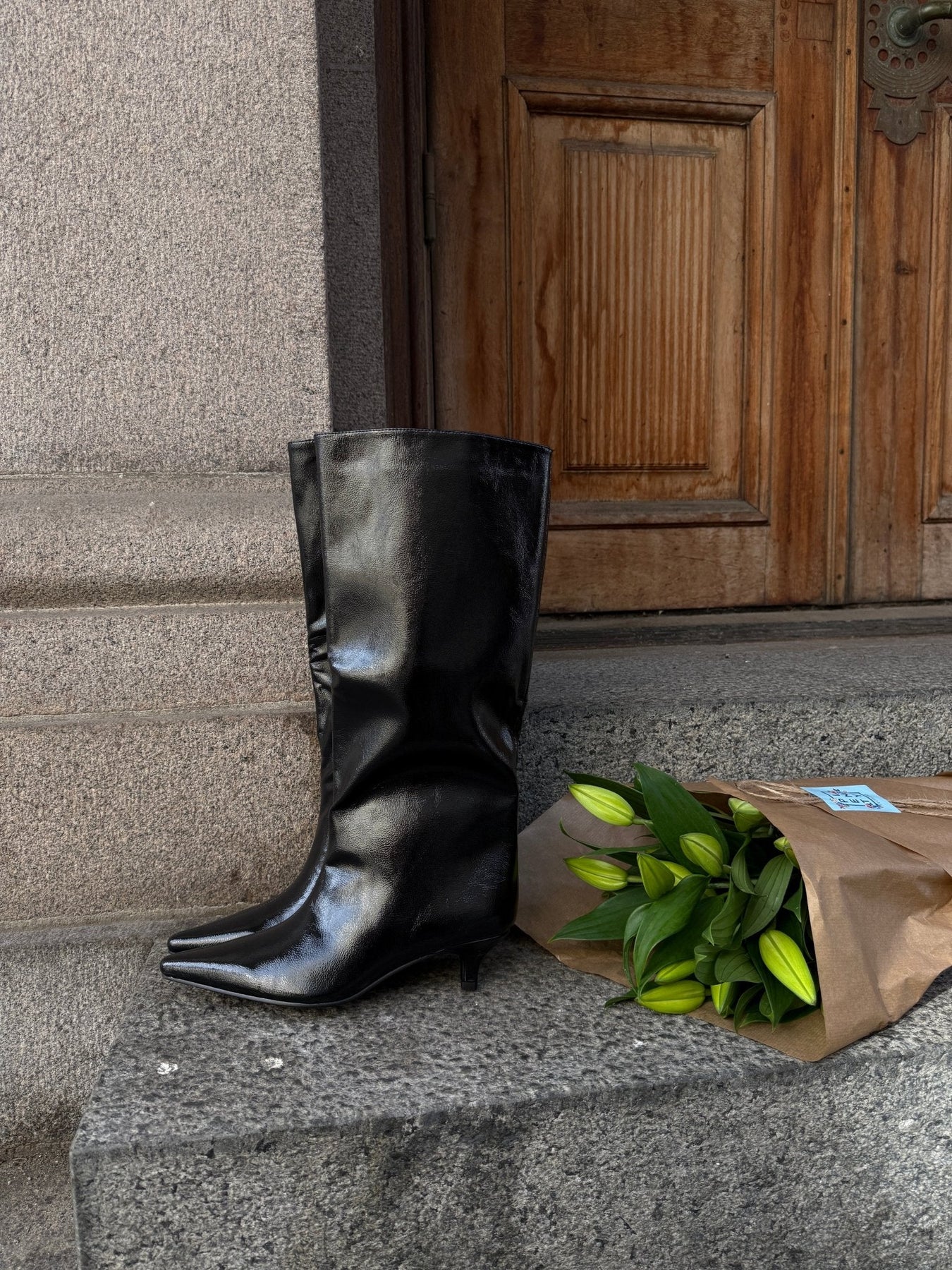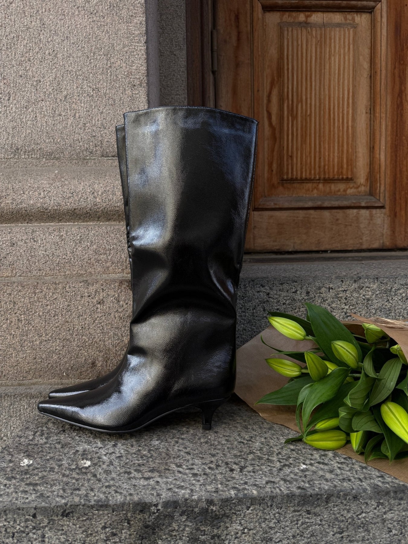 Unsere Madelaine Kunstlederstiefel sind elegante, kniehohe Stiefel mit einem klaren und modernen Look. Das glänzende Finish sorgt für einen raffinierten Look, während die spitze Schuhspitze und der niedrige Absatz einen femininen Touch verleihen.