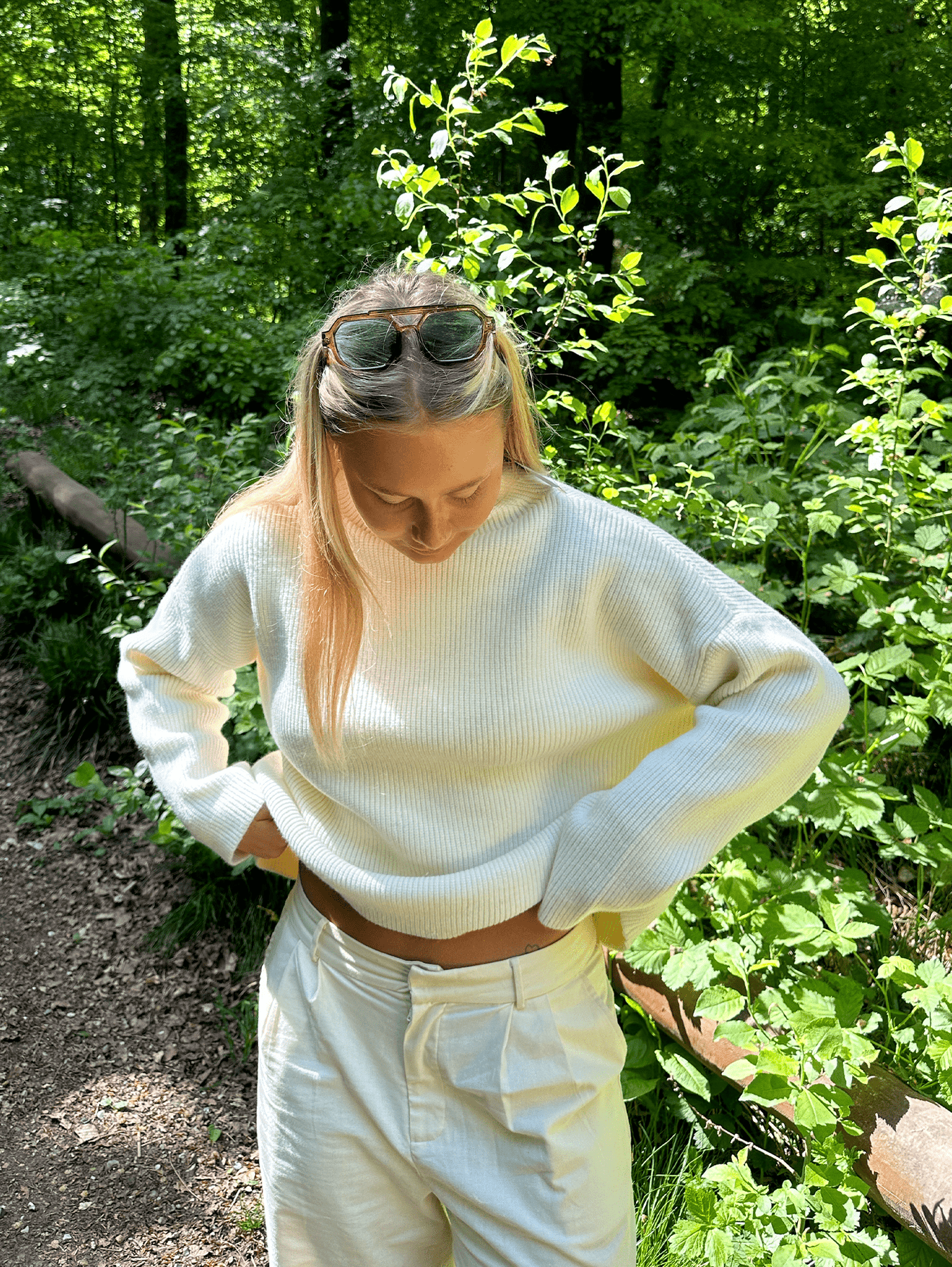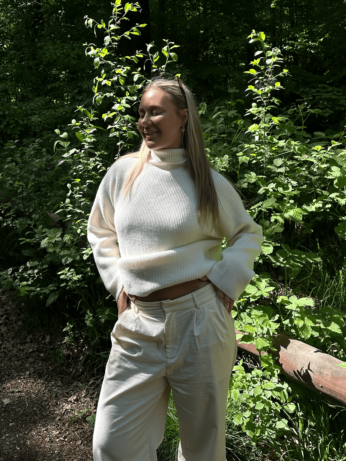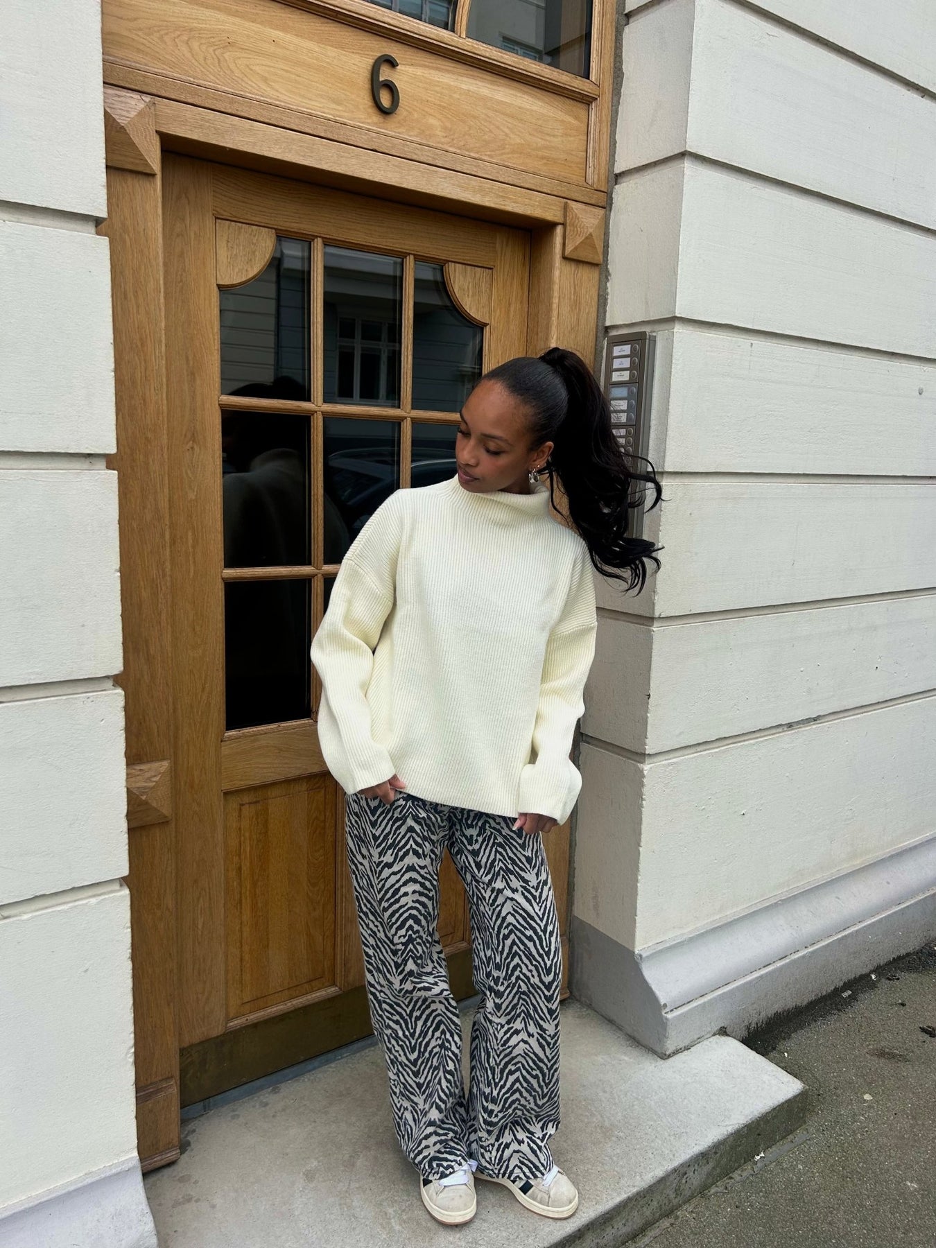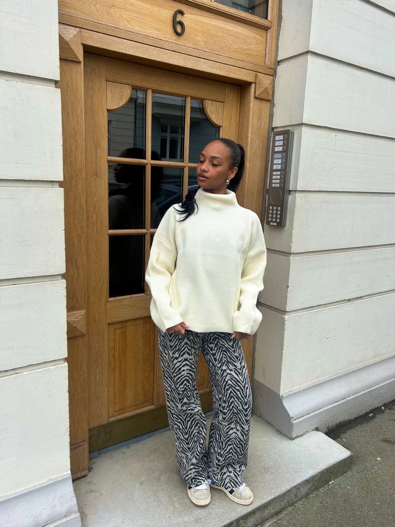 Schöner weicher Strickpulli mit hohem Halsausschnitt und weiten Ärmeln. Der Pullover ist dicht gestrickt und warm, perfekt zum Tragen unter einer leichten Jacke.