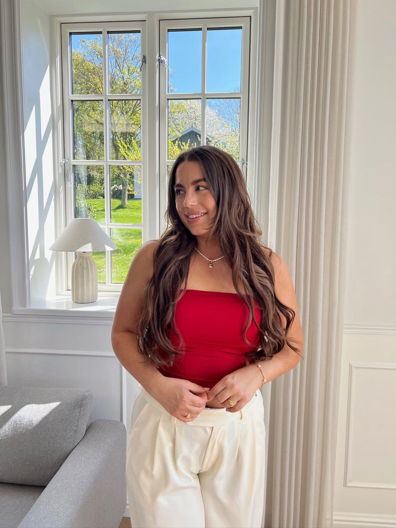 Dieses Bandeau-Top ist ein Must-Have für warme Tage und coole Outfits. Es sitzt eng und bequem ohne Träger für einen cleanen, stilvollen Look, der perfekt zu hoch taillierten Hosen, Röcken oder Shorts passt.