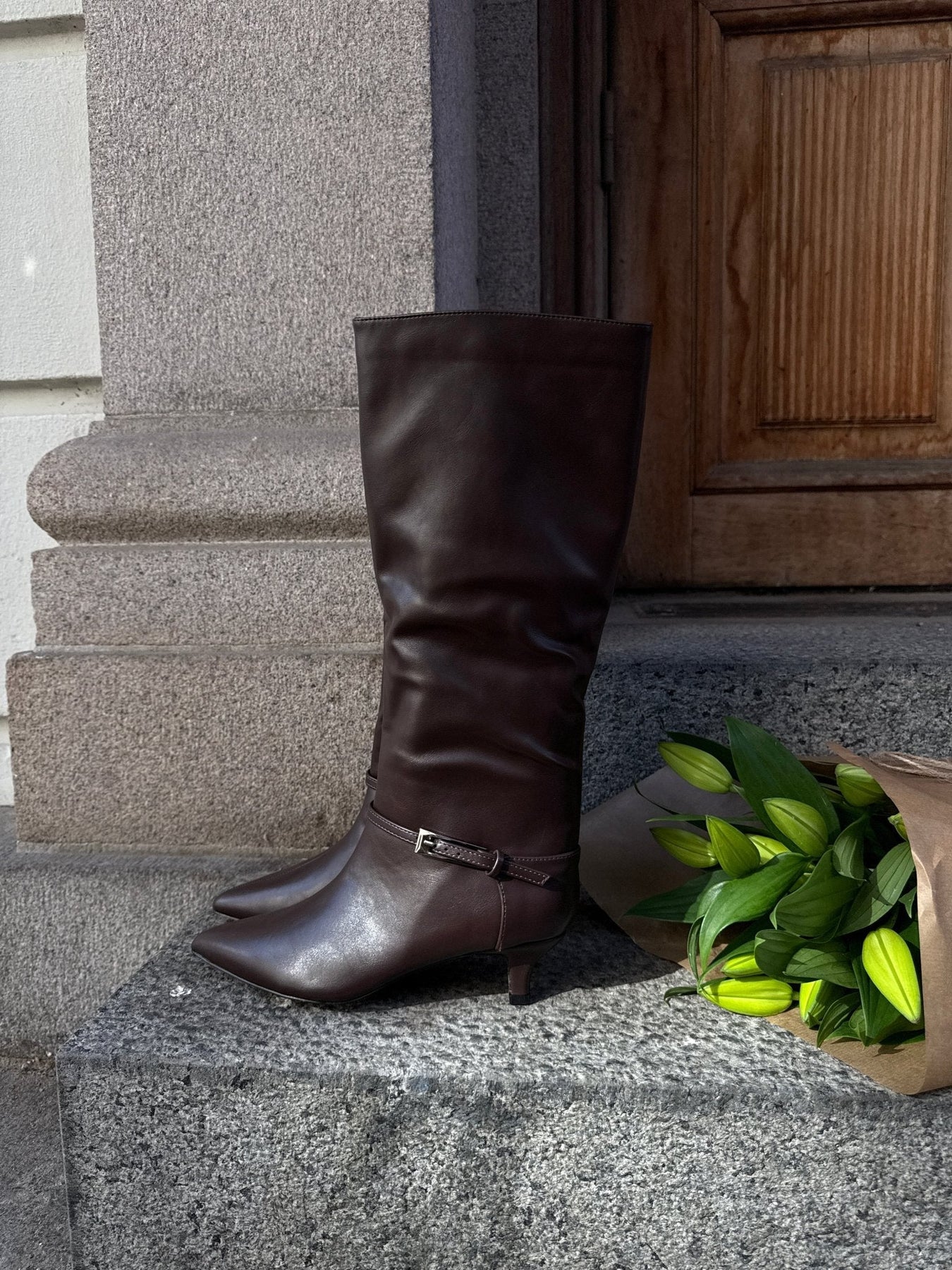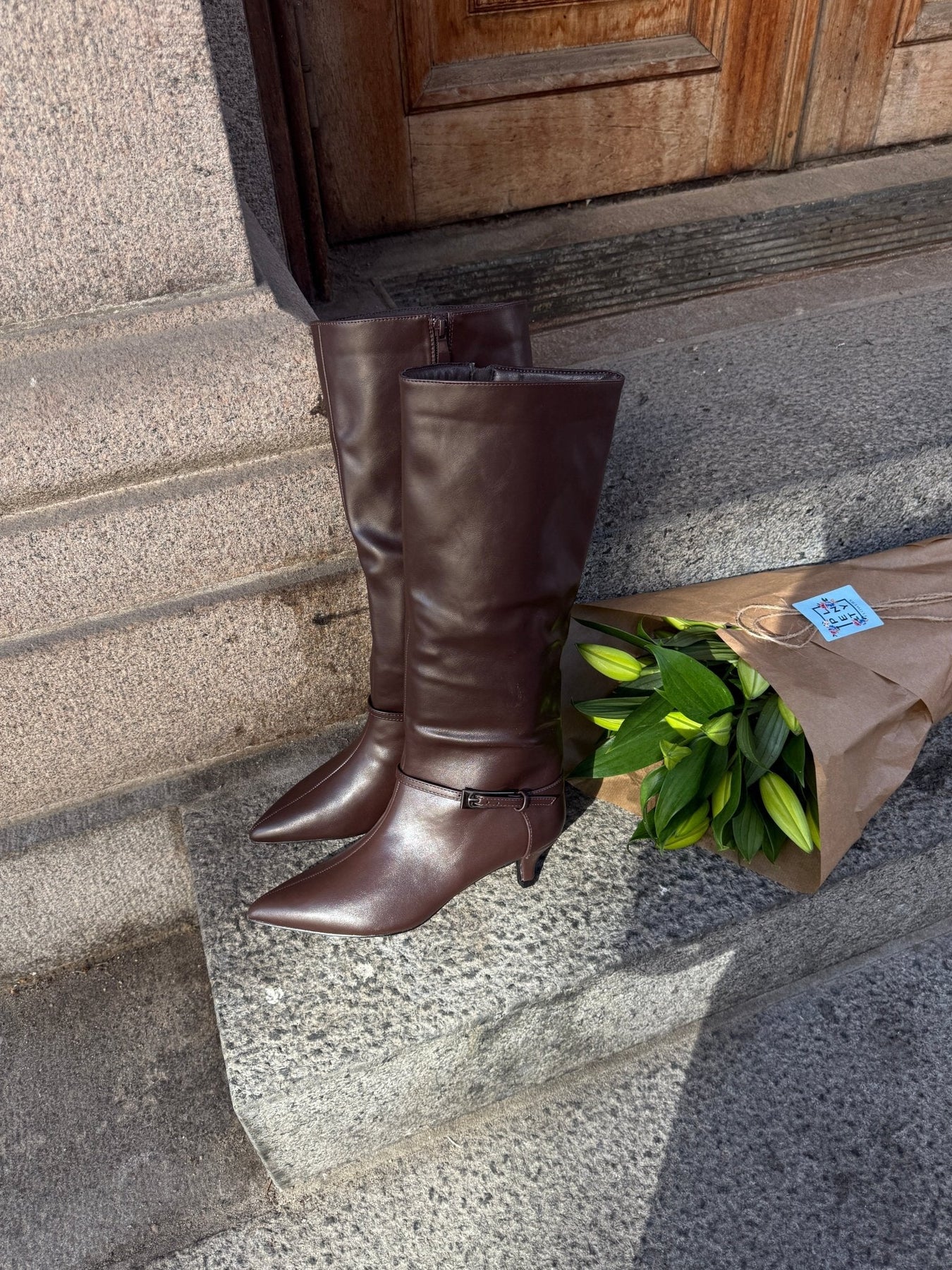 Verleihen Sie Ihrer Garderobe einen Hauch von klassischer Eleganz mit diesen schönen kniehohen Stiefeln in dunkelbrauner Lederoptik.