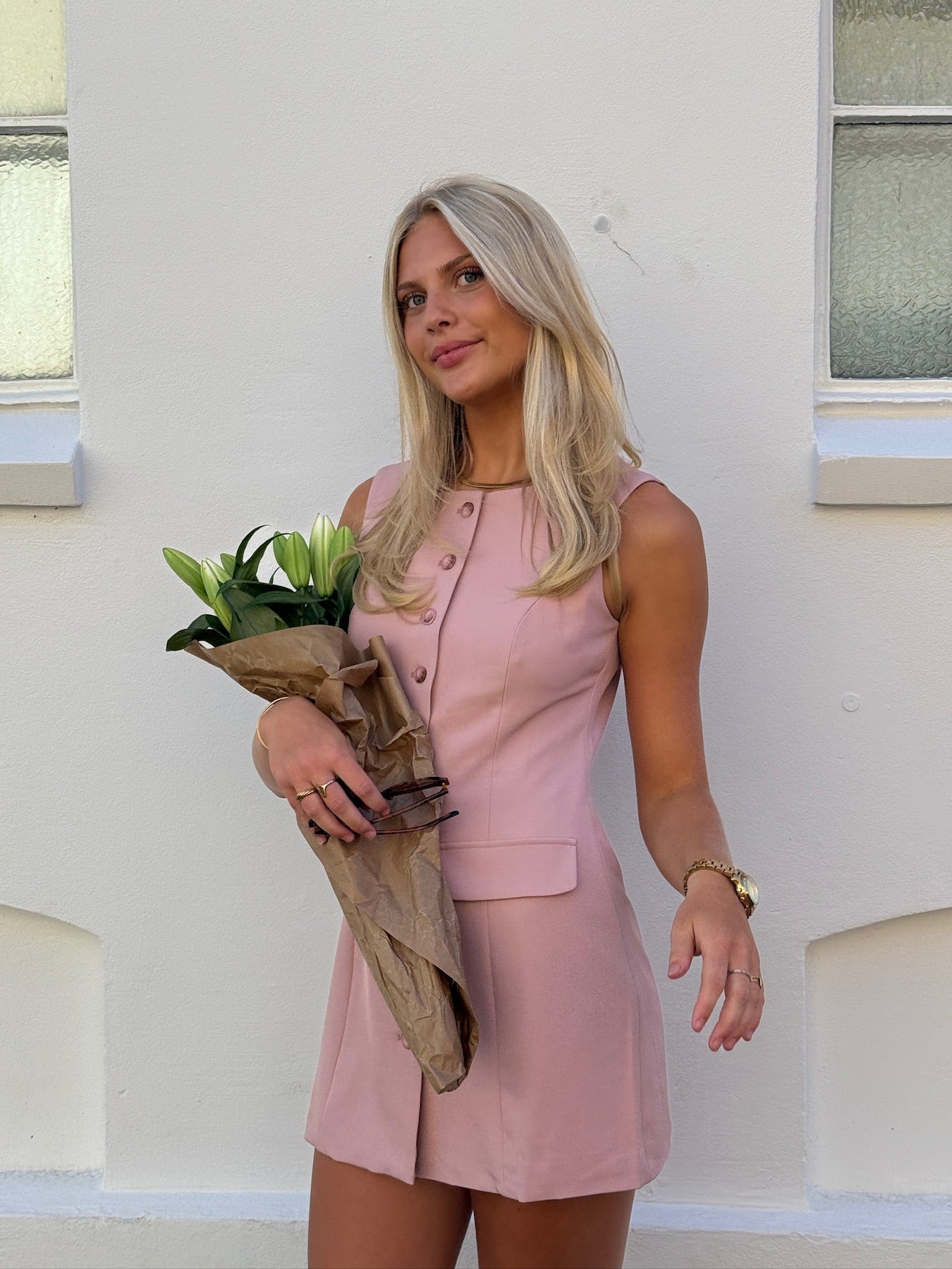 Mit seiner hübschen rosa Farbe, den schönen Knöpfen und der scharfen Taille ist dieses Kleid feminin, cool und super einfach zu stylen. Die kurze Länge und Details wie die Taschen und der Knopfverschluss verleihen ihm einen edlen Look, der sowohl für den Alltag als auch für Partys geeignet ist.