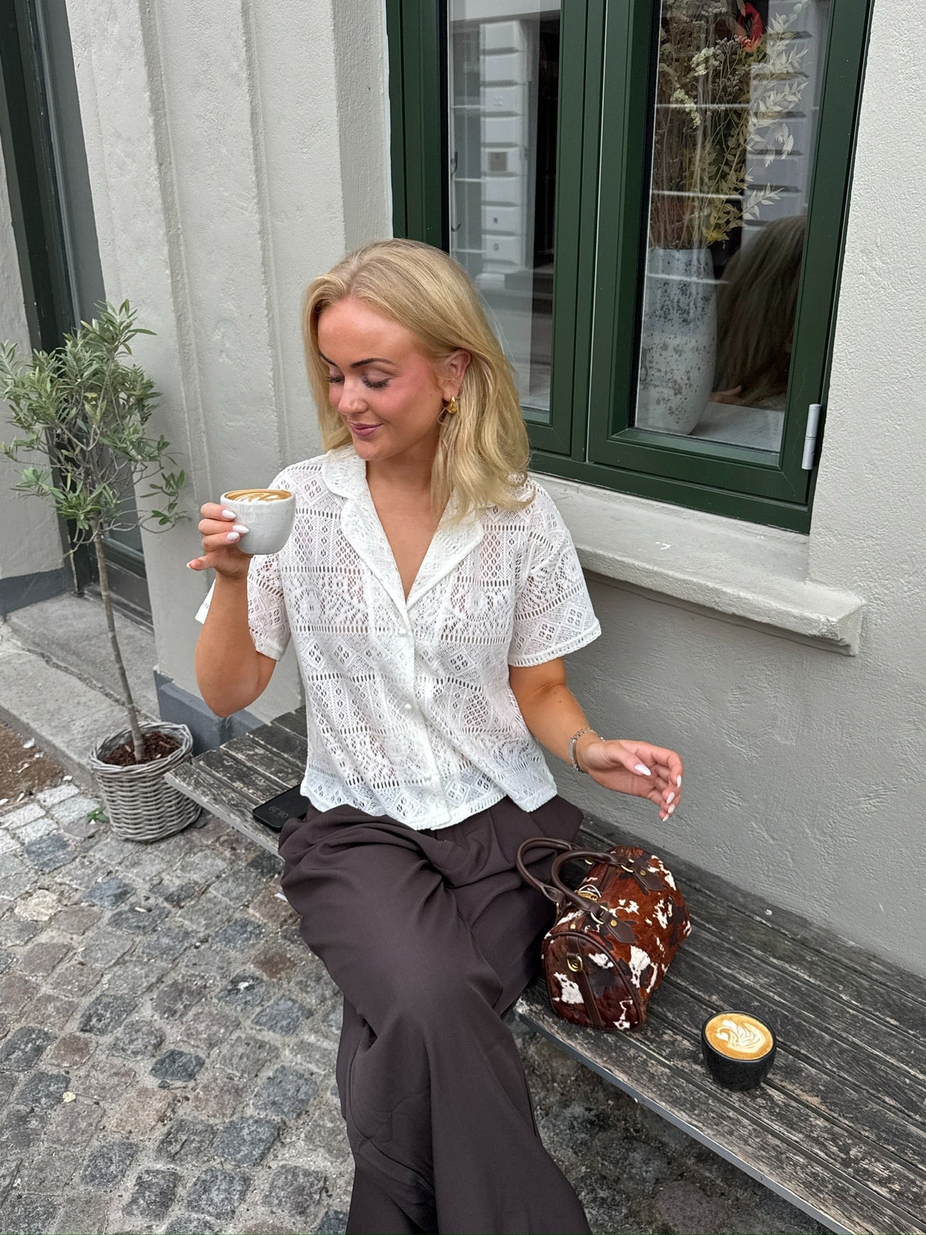 Das schwarze Häkelshirt ist der Inbegriff eines mühelosen Sommerstils. Mit seiner perforierten Struktur, den kurzen Ärmeln und dem klassischen Kragen verleiht es Ihrem Outfit sowohl Raffinesse als auch Weiblichkeit. Tragen Sie es offen über einem Badeanzug am Strand oder zugeknöpft für einen raffinierten und luftigen Alltagslook.
