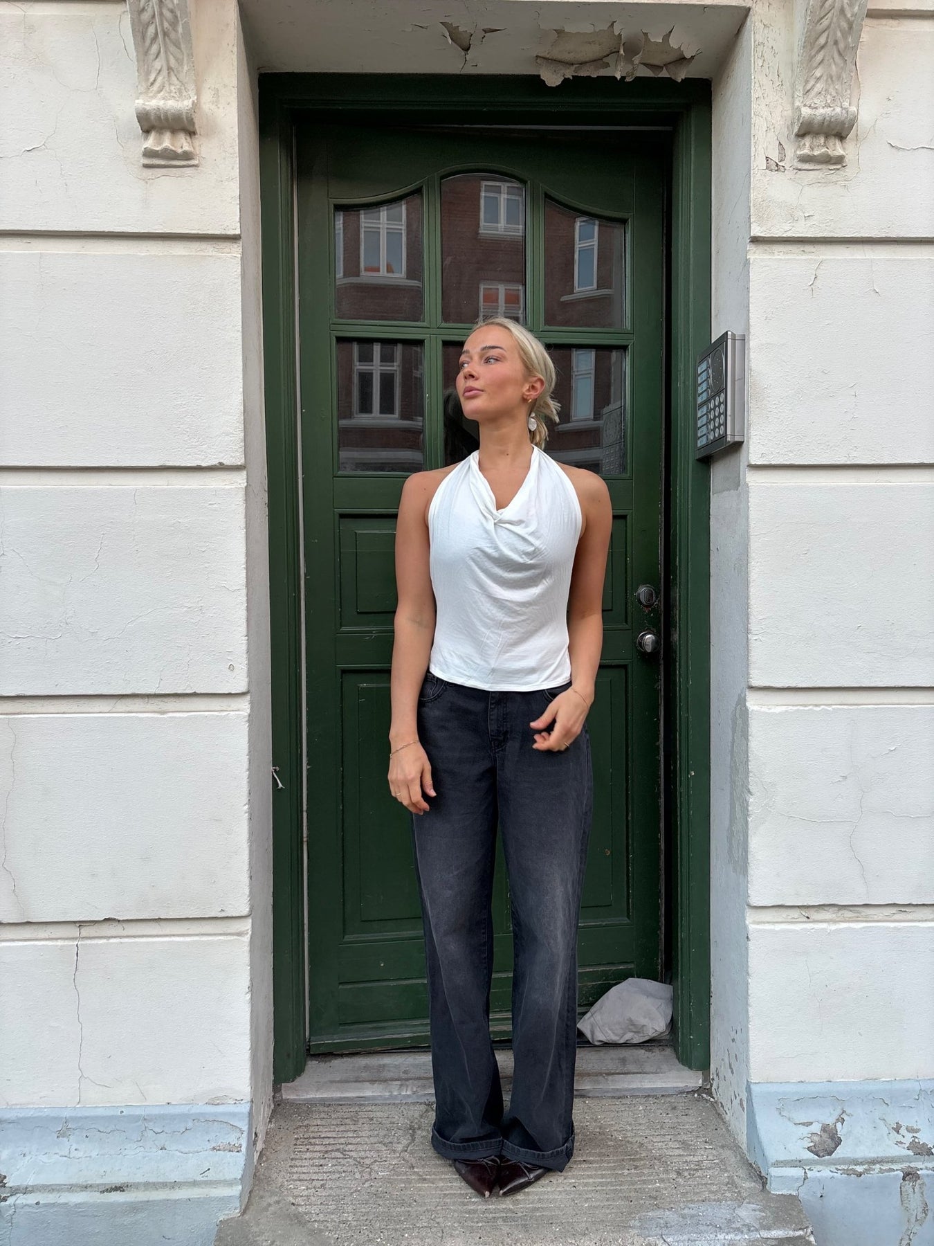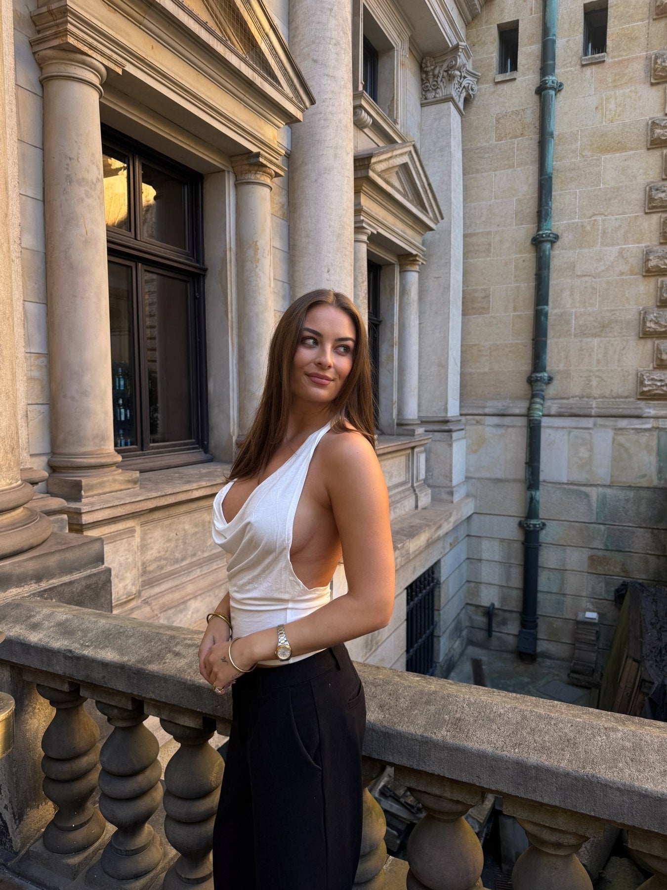 Dieses stilvolle Neckholder-Top kombiniert ein schmeichelhaftes Design auf der Vorderseite mit einem eleganten, offenen Rücken, der im Nacken gebunden wird und so eine verstellbare und feminine Passform ermöglicht. Die körpernahe Passform betont die Taille, während das leichte, weiche Material sowohl Komfort als auch einen exklusiven Faltenwurf bietet. Das Oberteil ist sowohl für den Alltag als auch für den Abend geeignet - kombinieren Sie es mit Jeans für einen lässigen Look oder mit einem Rock für formelle Anlässe.