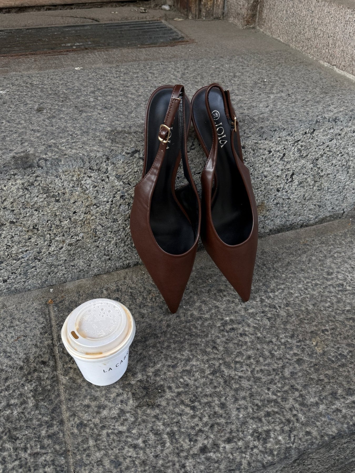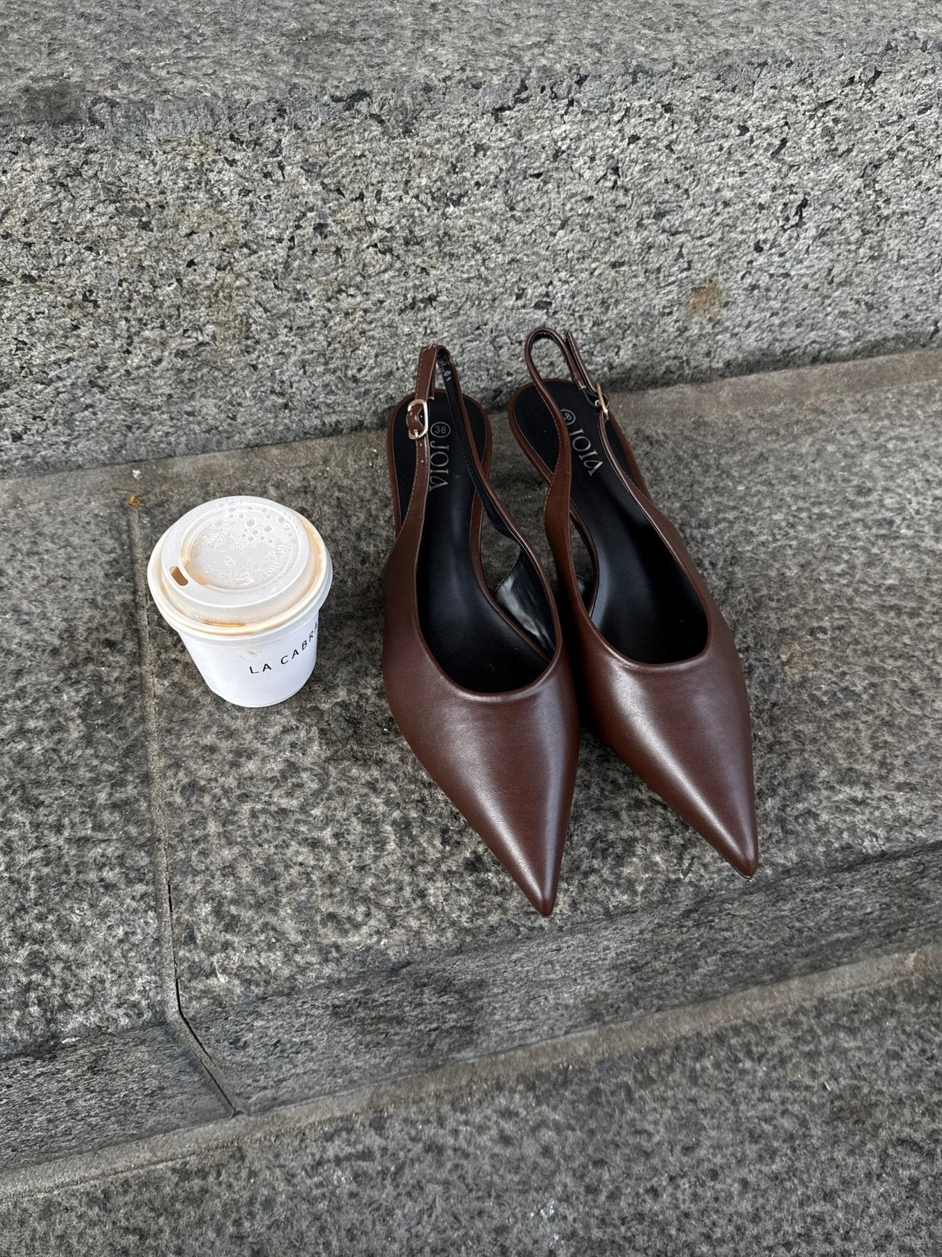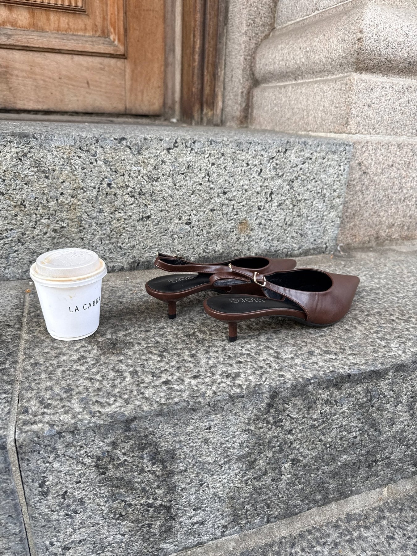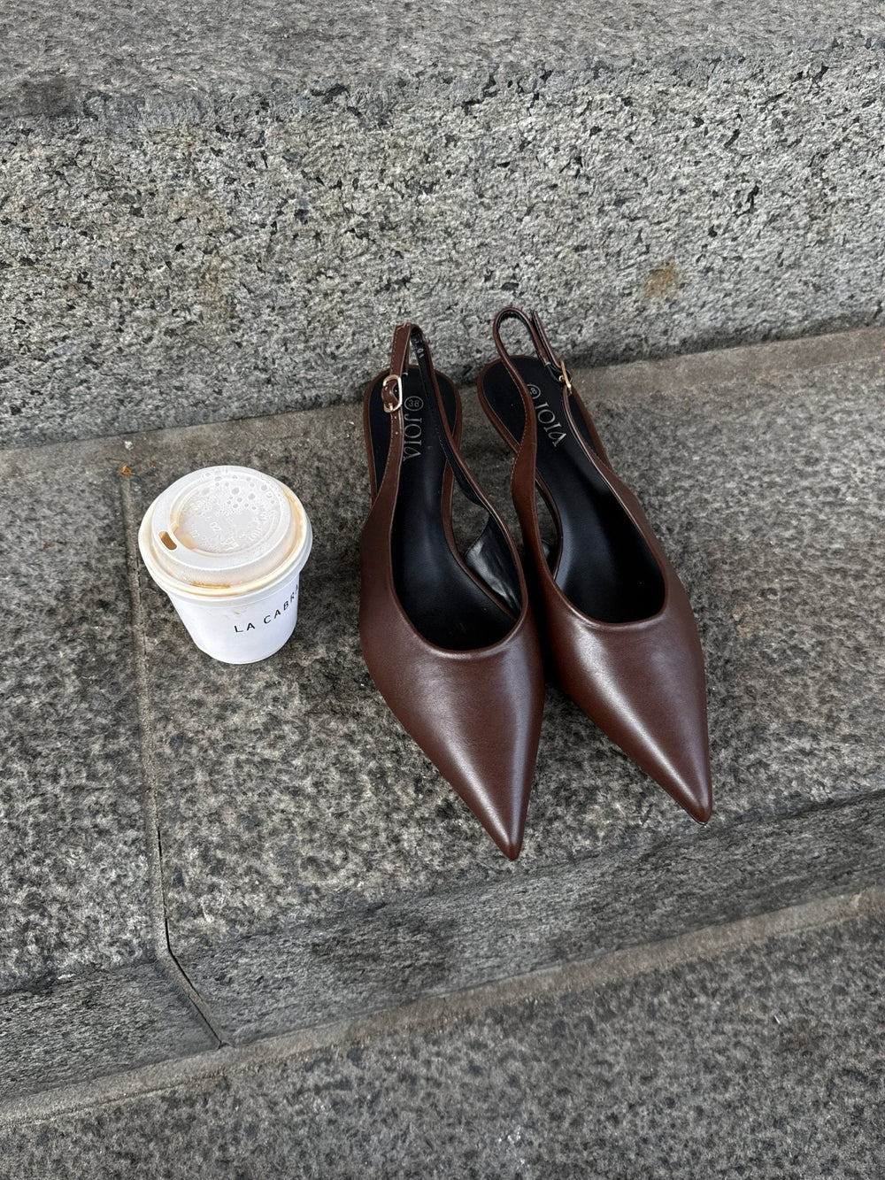 Der Thyra Slingback ist ein eleganter Stiletto mit spitzer Zehenpartie und niedrigem Stilettoabsatz. Der Schuh ist in einer unifarbenen dunkelbraunen Farbe mit leichtem Glanz für einen sauberen und minimalistischen Look ausgeführt.